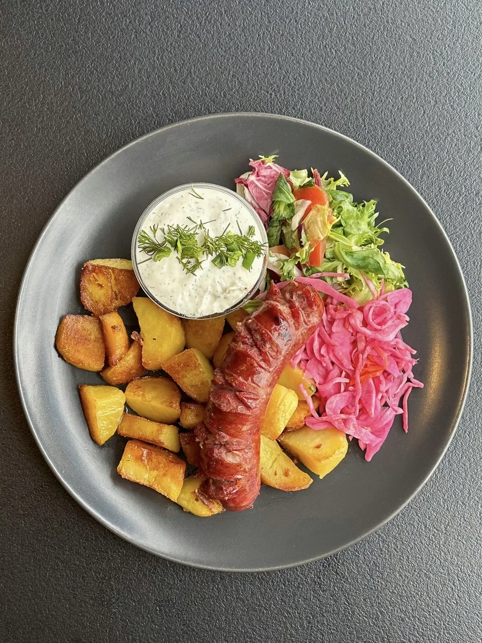 Koostisosad: kartul, külm kaste, salat, sealiha.