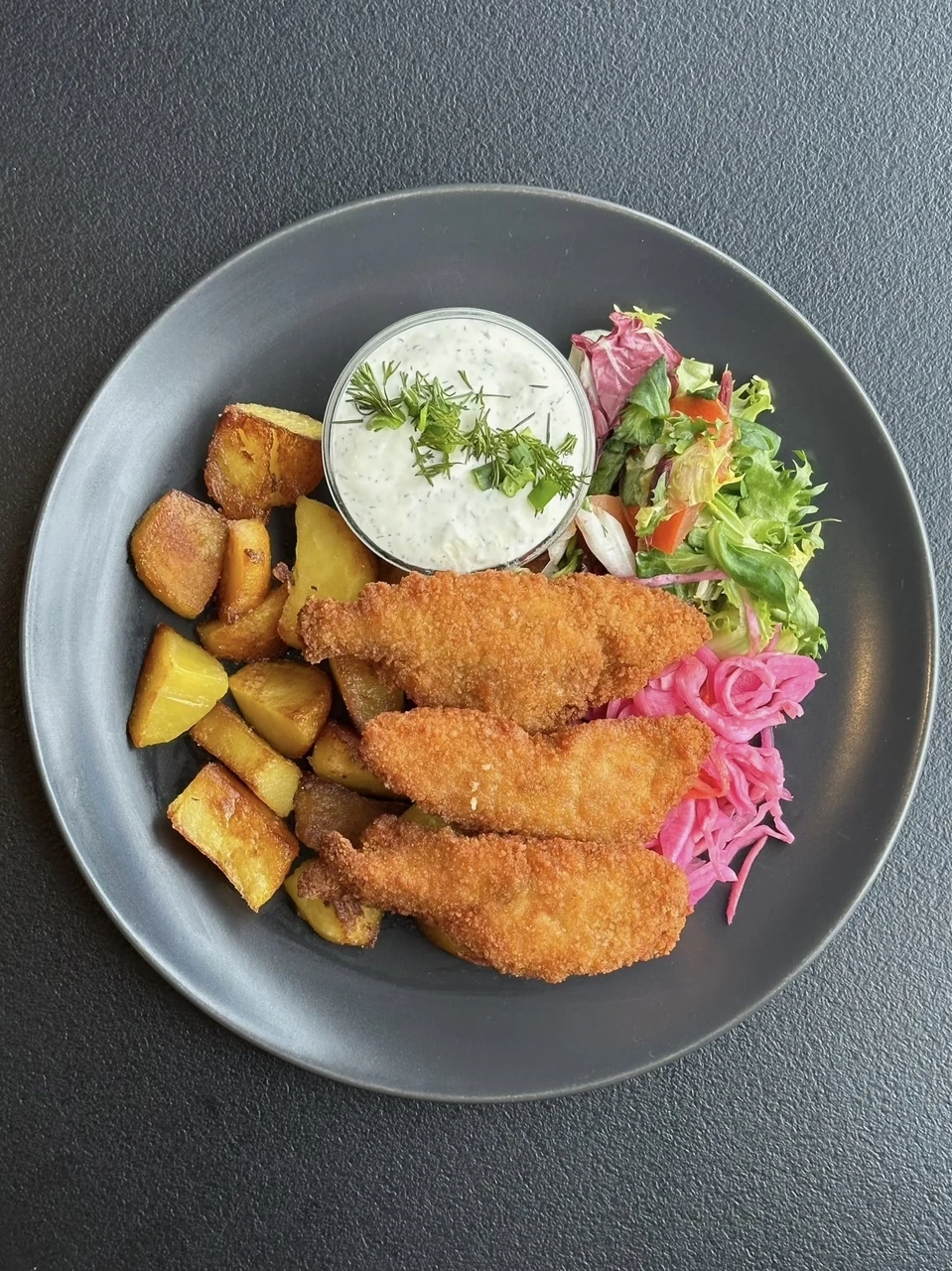 Koostisosad: kanafilee, riivsai, kartul, munad, külm kaste.