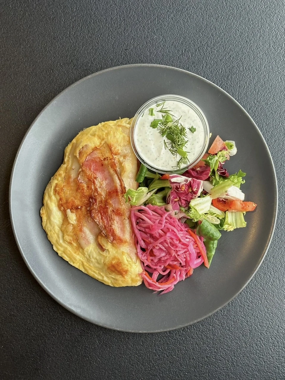 Koostisosad: munad, peekon, riivjuust, sibul, tomatid, salat, külm kaste.