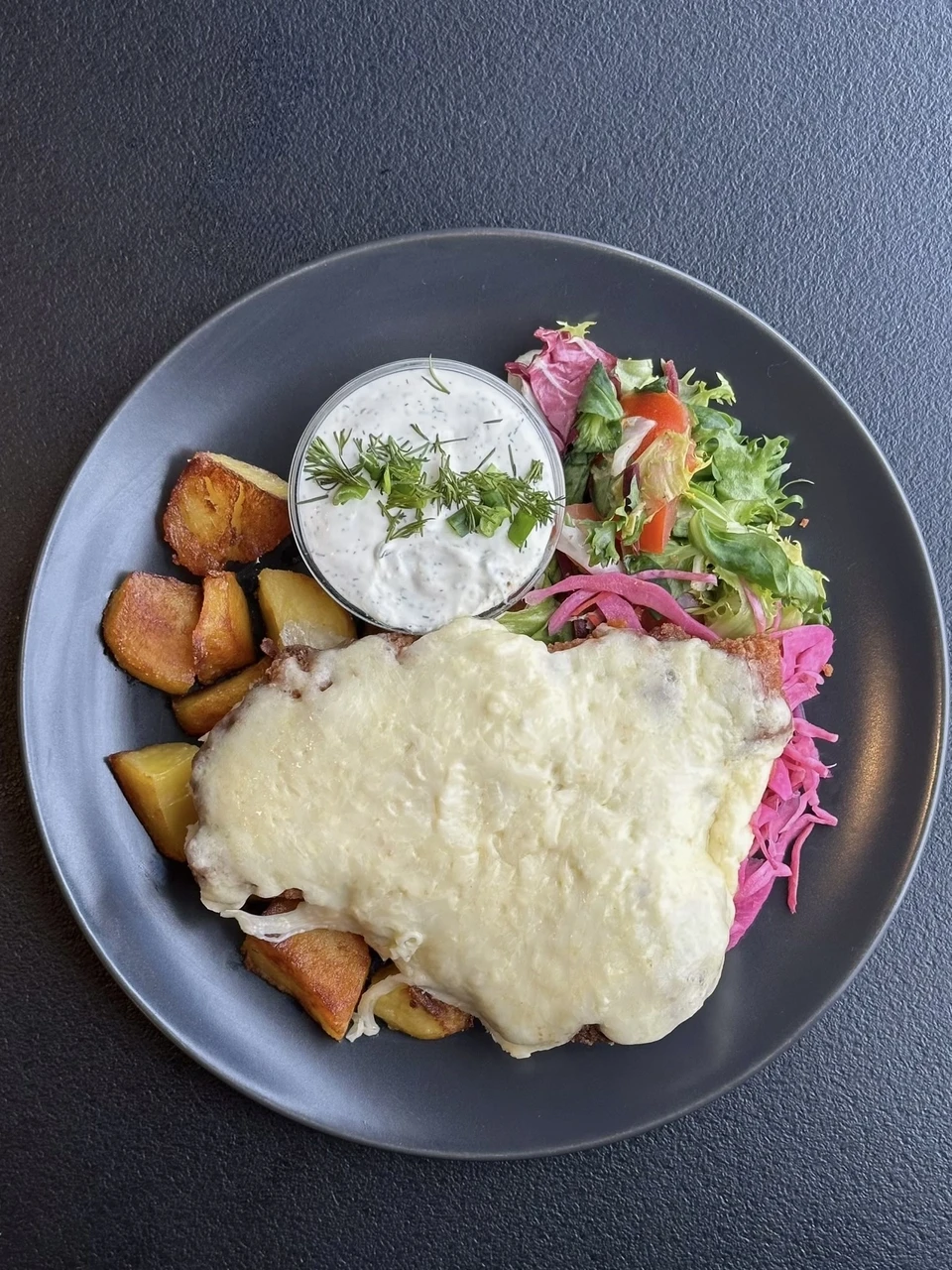 Koostisosad: kartul, salat, külm kaste, sealiha, riivsai, muna, majonees, riivjuust.