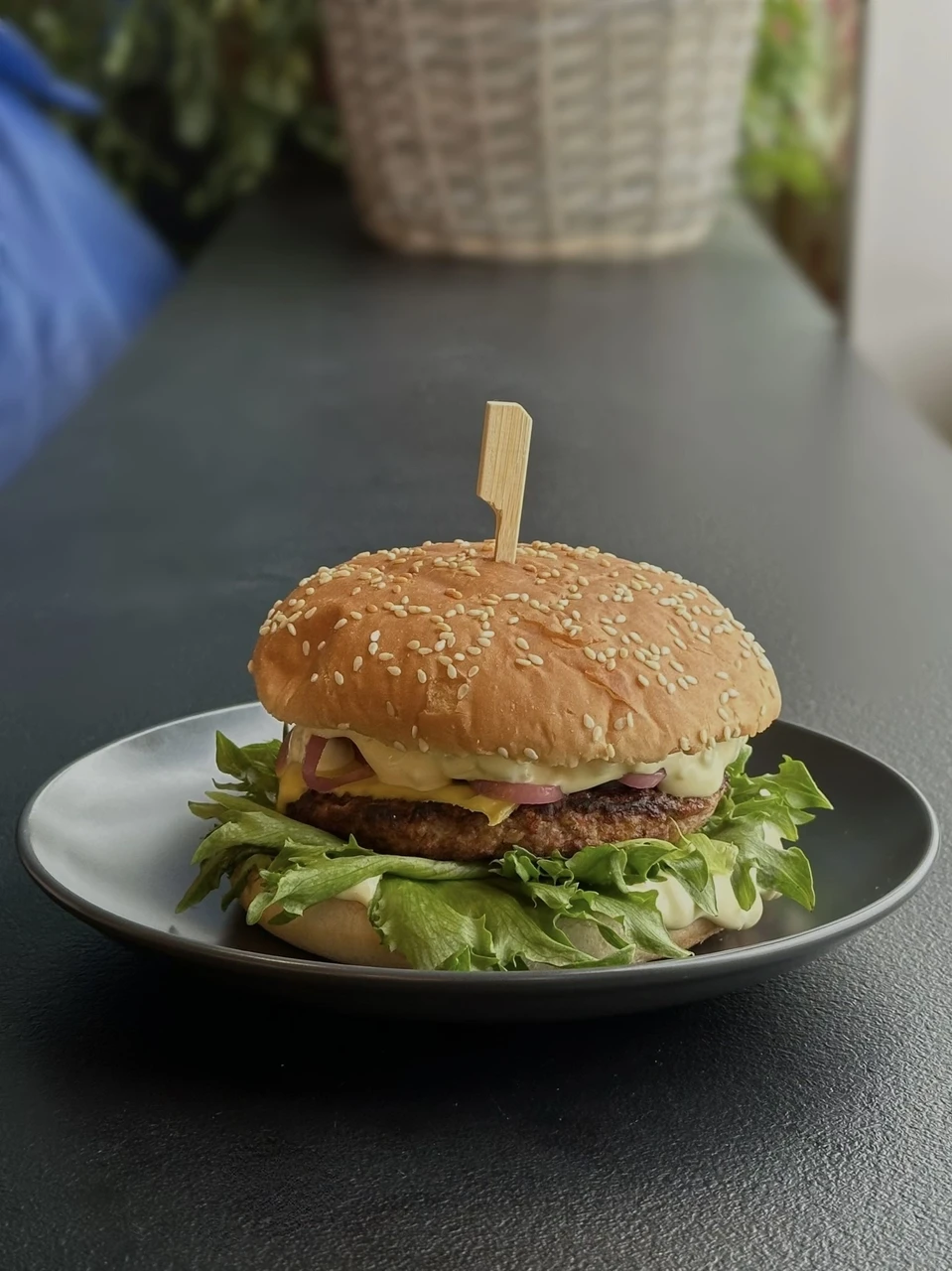 Koostisosad: Grillitud sai, frillis, kurgi-sinepi kaste, tomat, marineeritud kurk, grill pihv(veise), marineeritud sibul, juust.