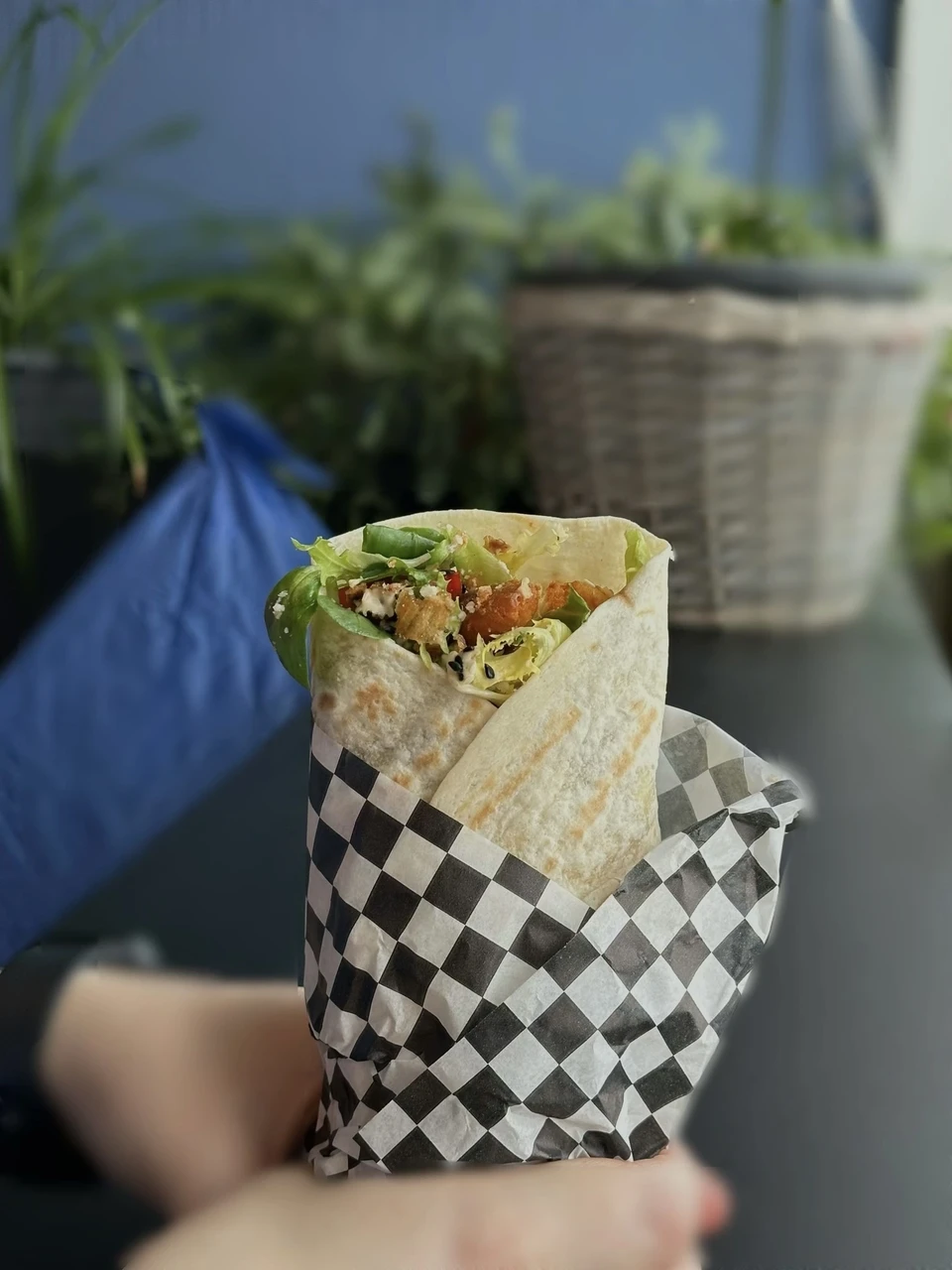 Koostisosad: Kurgi-sinepikaste, värske salat, kanafilee, marineeritud sibul, marineeritud kurk.