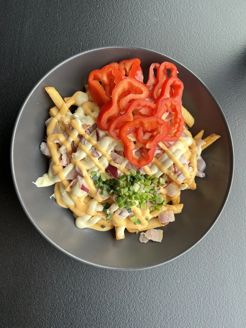 Koostisosad: Friikartul, friikartuli maitseaine, majonees, chedar juust, magus papprika, punane sibul, roheline sibul, peekon.