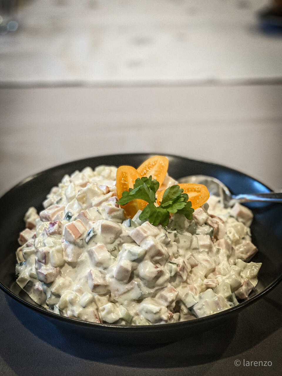 Koostis: keeduvorst (sealiha (35%), vesi, veiseliha (12%), seakamar, seapekk, vadakupulber(sh piim), tärklis, muna, sool, stabilisaatorid: E450, E452, lõhna- ja maitseained, vürtsid, happesuse regulaator: E451, antioksüdant: askorbiinhape, säilitusaine: E250. Võib sisaldada vähesel määral soja, sellerit ja sinepit), keedukartul, värske kurk, täissuitsuvorst(veiseliha 55%, sealiha 27%, joogivesi, keedusool, maitseained), hapukoor, majonees (rapsiõli, vesi, suhkur, sool (1,1%), lõssipulber, munakollasepulber, sinepipulber, paksendajad (tärklis, ksantaankummi), happesuse regulaatorid (äädikhape, sidrunhape), säilitusained (kaaliumsorbaat, naatriumbensoaat), toiduvärv (beeta-karoteen)).