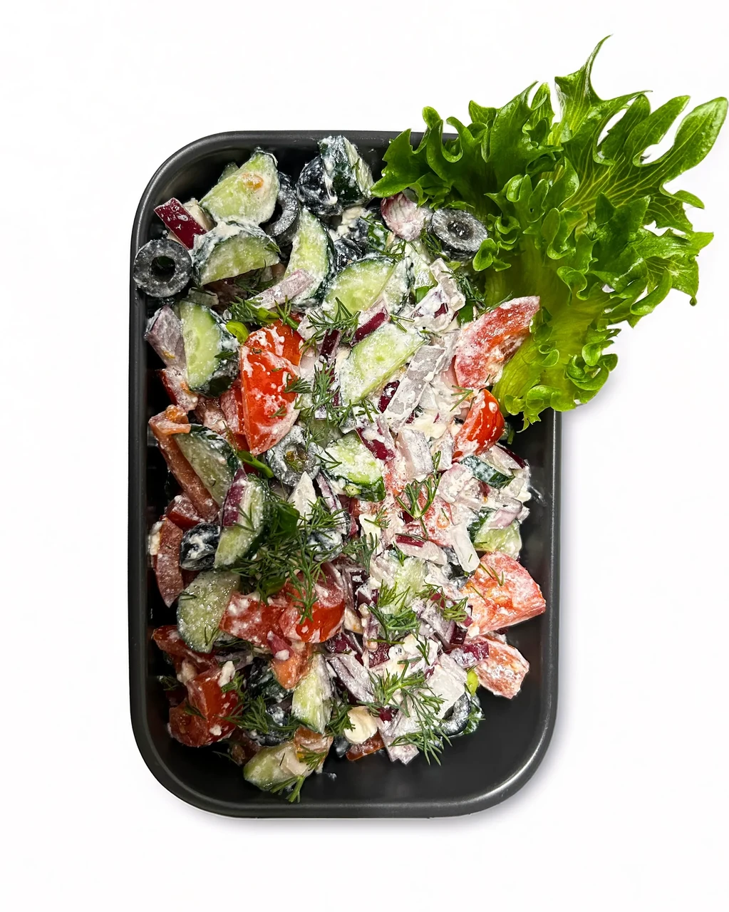 Koostiosad: tomatid,värsked kurgid, paprika, punane sibul , fetajuust, oliivid , oliiviõli, sidrunimahl.