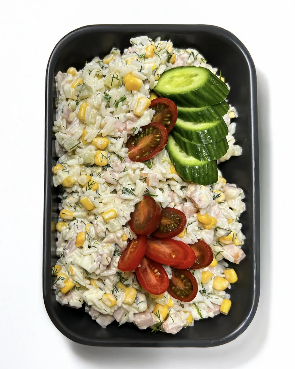 Koostiosad: sutsukanafilee, keedetud riis, marineeritud kurgid, mais, keedetud muna, majonees, till.