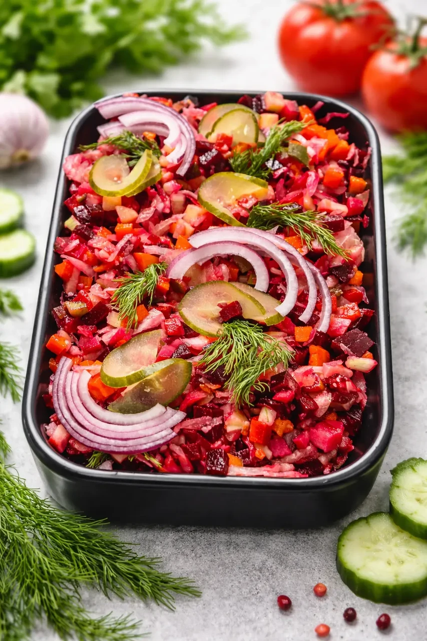Koostiosad: keedetud peet, keedetud kartul, keedetud porgand, hapukapsas, marineeritud kurgid, sibul, taimeõli.