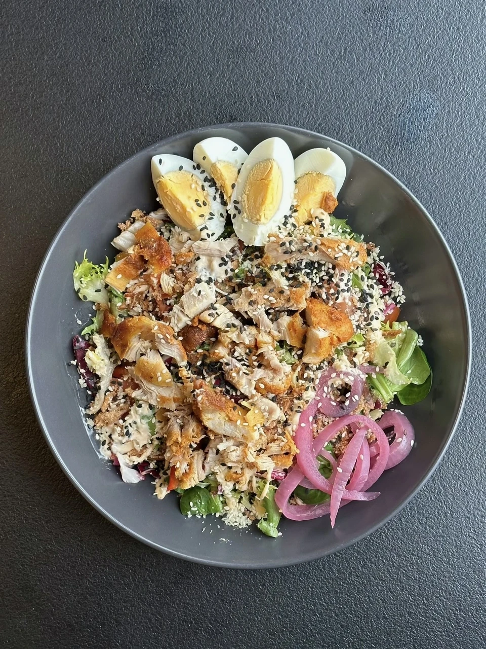 Koostisosad: salat mix, salati maitseaine, tomatid, keedu munad, juust, sibulakrõpsud, marineeritud sibul, mango-majoneesi kaste, kanafilee, seesamiseemned.