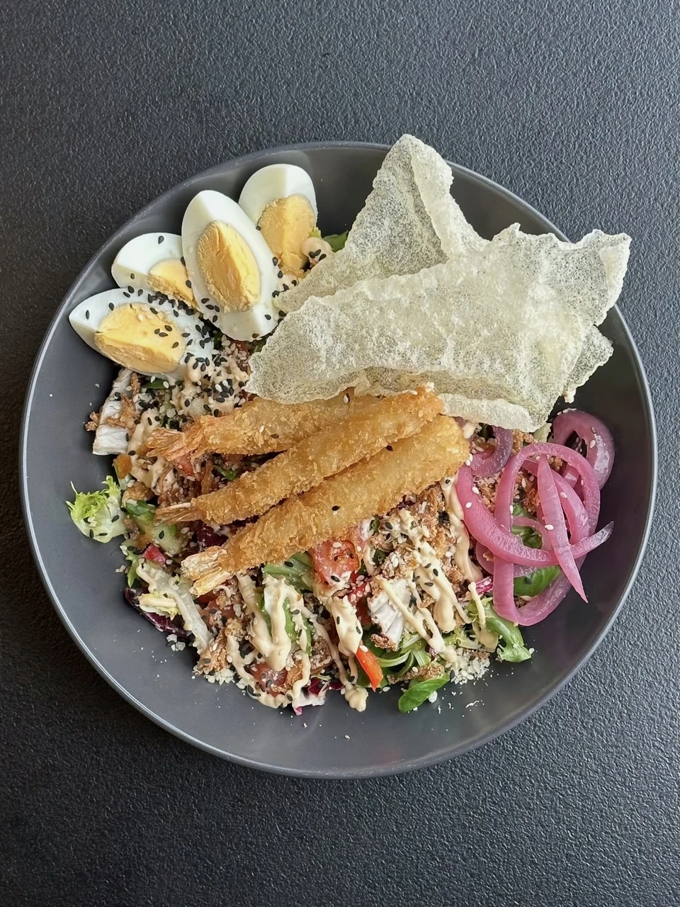 Koostisosad: salati mix, tomatid, salati maitseaine, juust, keedu munad, marineeritud sibul, majoneesi-chilli kaste, krevetid, nisujahu, seesamiseemned, maisihelbed.