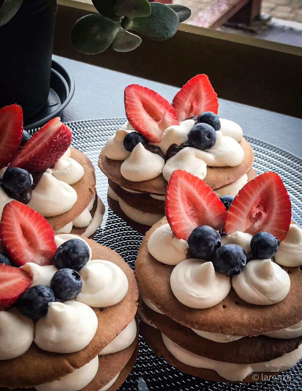 Meetaignast ja toorjuustukreemist valmistatud kihiline meekook koos värskete marjadega.