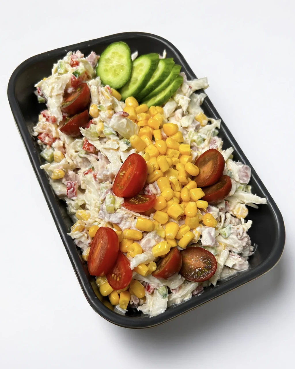 Koostisosad: suitsukanafilee, hiina kapsas, värsked kurgid, paprika, mais, kreeka jogurt, sinep, till.