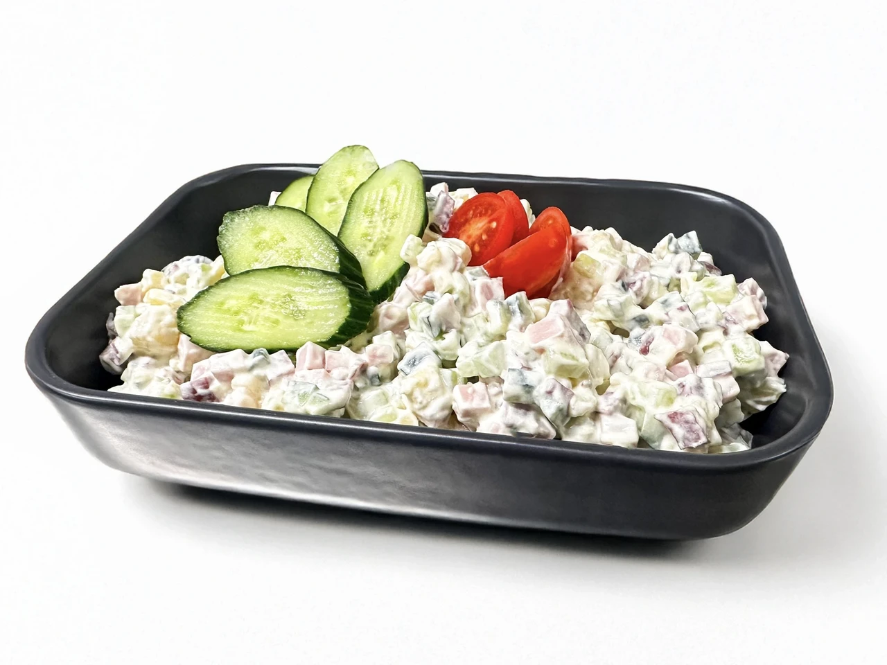Koostis: keeduvorst (sealiha (35%), vesi, veiseliha (12%), seakamar, seapekk, vadakupulber(sh piim), tärklis, muna, sool, stabilisaatorid: E450, E452, lõhna- ja maitseained, vürtsid, happesuse regulaator: E451, antioksüdant: askorbiinhape, säilitusaine: E250. Võib sisaldada vähesel määral soja, sellerit ja sinepit), keedukartul, värske kurk, täissuitsuvorst(veiseliha 55%, sealiha 27%, joogivesi, keedusool, maitseained), hapukoor, majonees (rapsiõli, vesi, suhkur, sool (1,1%), lõssipulber, munakollasepulber, sinepipulber, paksendajad (tärklis, ksantaankummi), happesuse regulaatorid (äädikhape, sidrunhape), säilitusained (kaaliumsorbaat, naatriumbensoaat), toiduvärv (beeta-karoteen)).