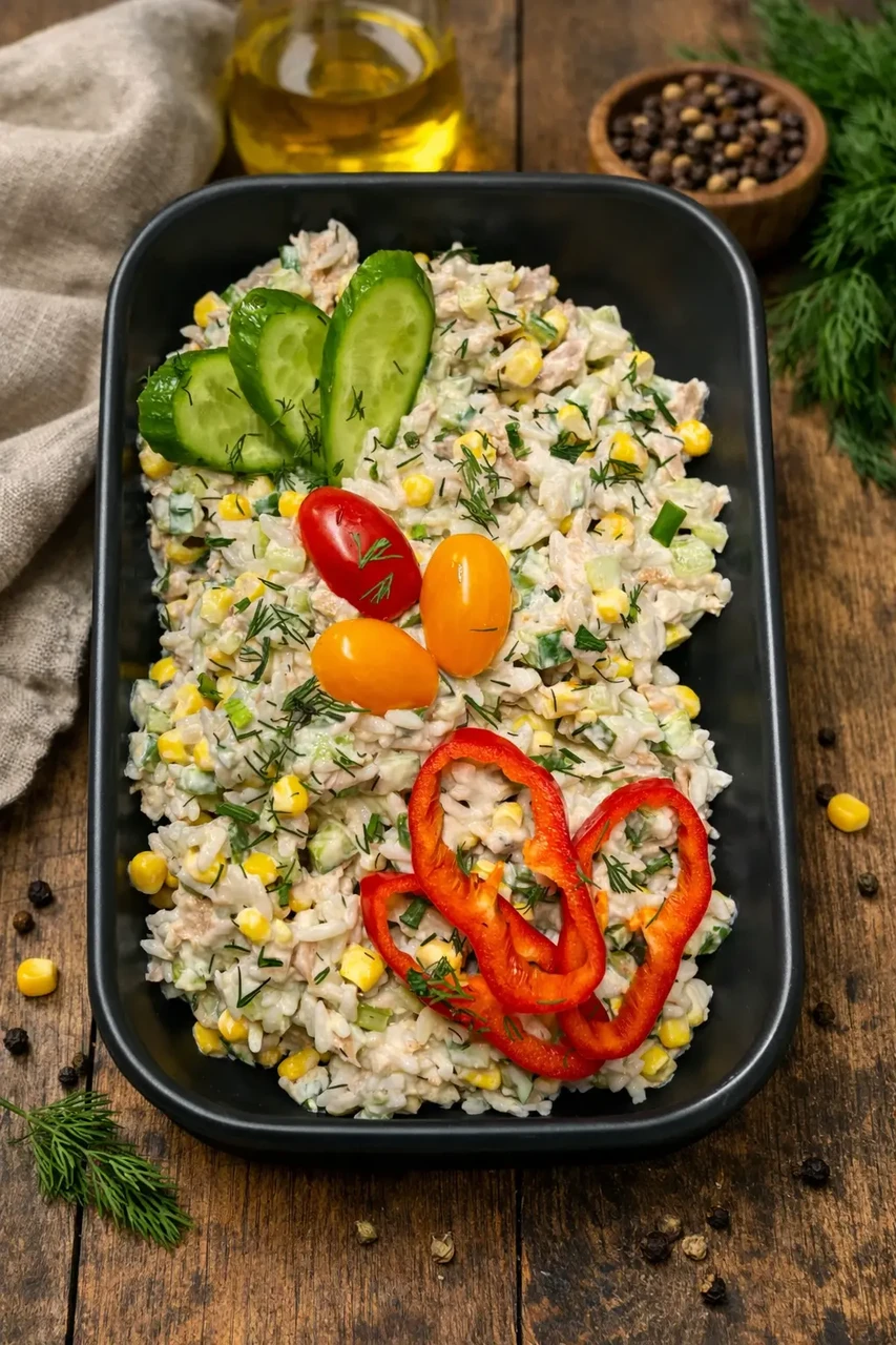 Koostiosad: Tuunikala, keedetud riis, värsked kurgid , mais, kreeka jogurt ,sidruni mahl , till.