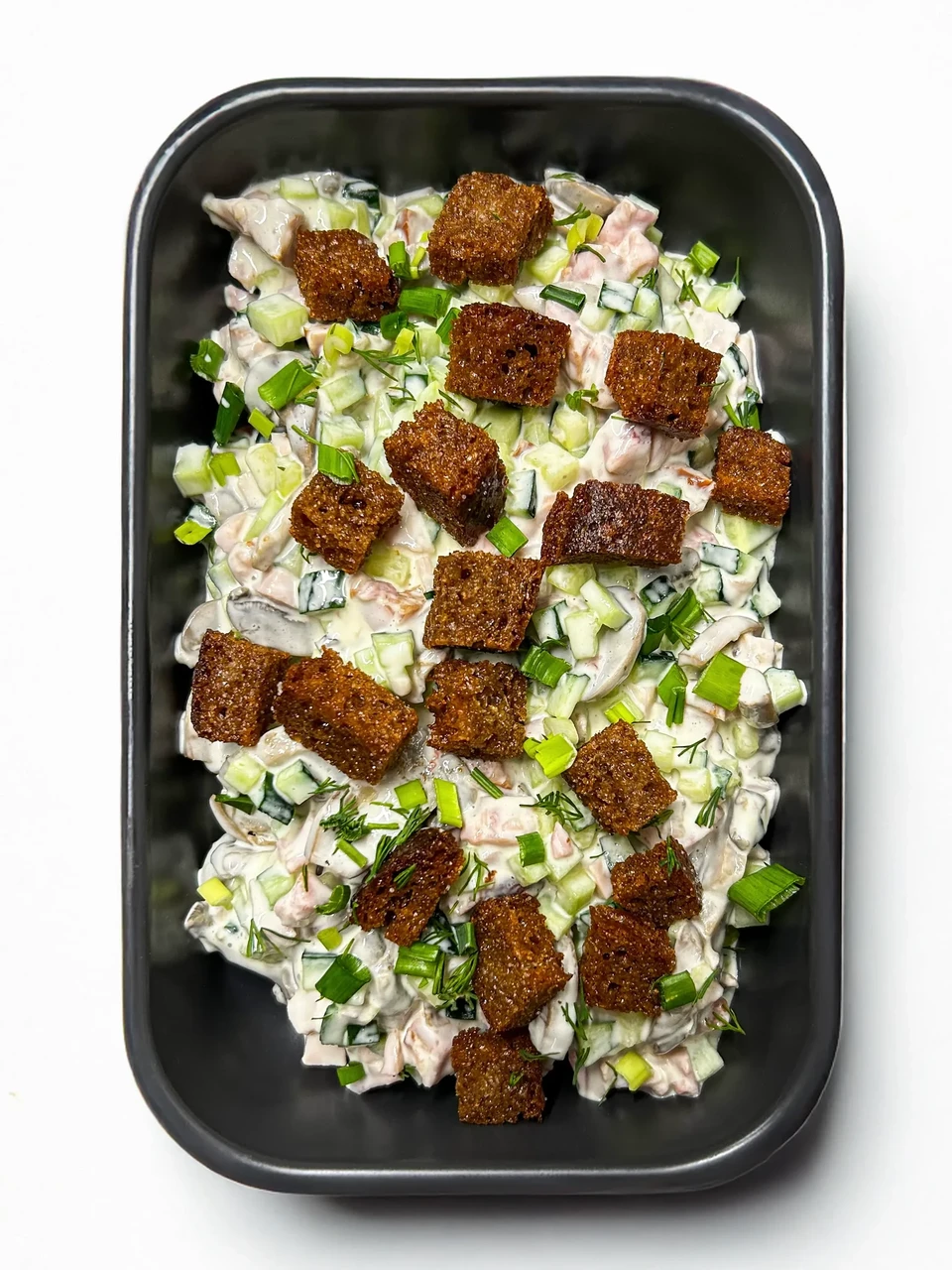 Koostisosad: šampinjoonid, värske kurk, suitsukana , sulatud juust, majonees, leivalrõpsud.