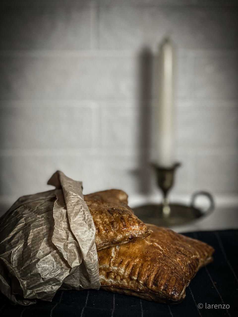 Pärmi-lehttaignast suur pirukas viineri ja kurgi-sinepi salati täidisega.